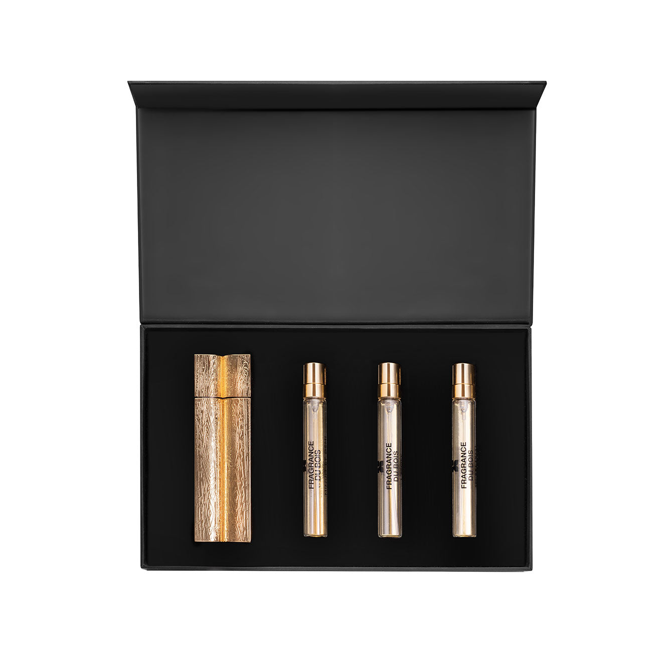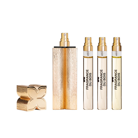Introducing the Fragrance Du Bois For Lovers Coffret de Voyage, a mesmerising compendium of sensual scents designed to accompany you wherever your romantic encounters take you. Made for love, this trio of irresistible fine fragrances are presented in convenient, portable 7.5ml vials perfect for pockets, carry-on and spur of the moment liaisons. A poignant gift that needs no words for someone special or an intimate companion for those with an unwavering sense of wanderlust. Simply slip your chosen fragrance from the For Lovers Collection into the luxurious gold atomiser and unleash your fragrant power. Will it be the intoxicating allure of rich, woody Secret Tryst with its heart notes of jasmine and saffron, enveloped in a sensual cedarwood base? Or perhaps the intensely intimate Cavort, a warm woody floral aphrodisiac infused with sultry saffron and soft, creamy sandalwood? Or maybe the softly seductive yet potent warm woody aroma of Lovers with its complex blend of fruity florals? Whichever you choose, this unique union of fine fragrances are crafted to ignite, delight and excite. The atomiser is expertly crafted from a robust zinc aluminium alloy, ensuring both strength and longevity, and benefits from a magnetic cap. Its surface boasts a meticulously rendered wood grain effect, a nod to the brand’s commitment to incorporating premium wood notes and extracts in numerous fragrances within their collection.