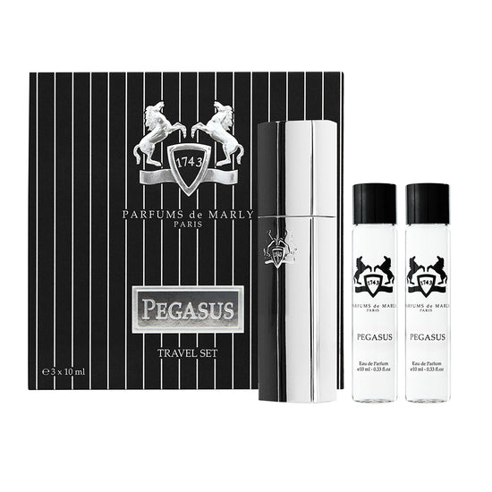 French fine fragrance house, Parfums De Marly revives the spirit of lavish receptions and festivities held in the Château de Marly, for the delight of members of the Royal Court and foreign dignitaries. Pegasus is a heady fougere scent that adds a touch of Equestrian royalty to its distinct masculine flavour that is made up of bergamot, almond, vanilla, sandalwood and amber. Now available in this fabulous travel set with a stylish Zamac atomiser and three 10ml refills.
