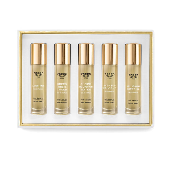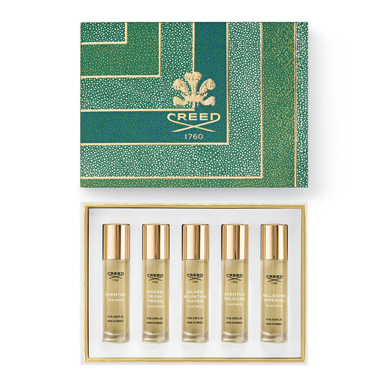 Tailor-made for those who appreciate truly exceptional fragrance, the Men’s 5-Piece Gift Set invites them to unwrap excellence through a curated collection of masterpieces from The House of Creed. This set welcomes Aventus, Green Irish Tweed, Silver Mountain Water, Aventus Cologne and Millésime Impérial, five extraordinary signatures celebrated across the globe for their distinctive charm and timeless allure. Presented in decadent 10ml editions designed for discovery and celebration, and finished with striking emerald-green packaging inspired by Art Deco design, this set – shaped by both craft and intention – is designed to be remembered, not just received.