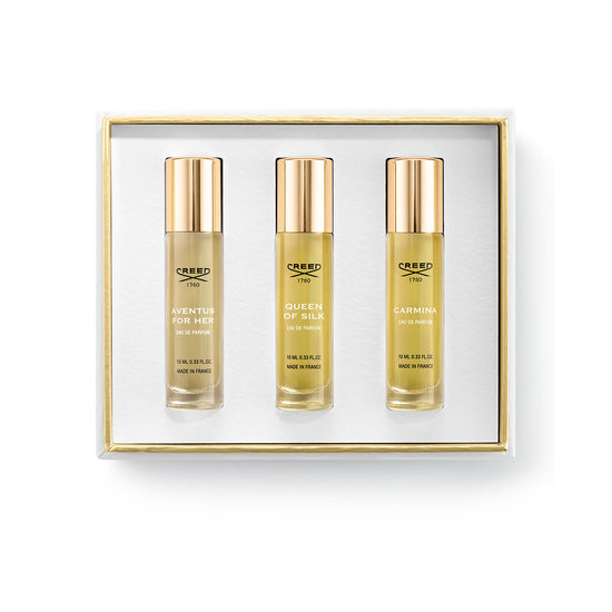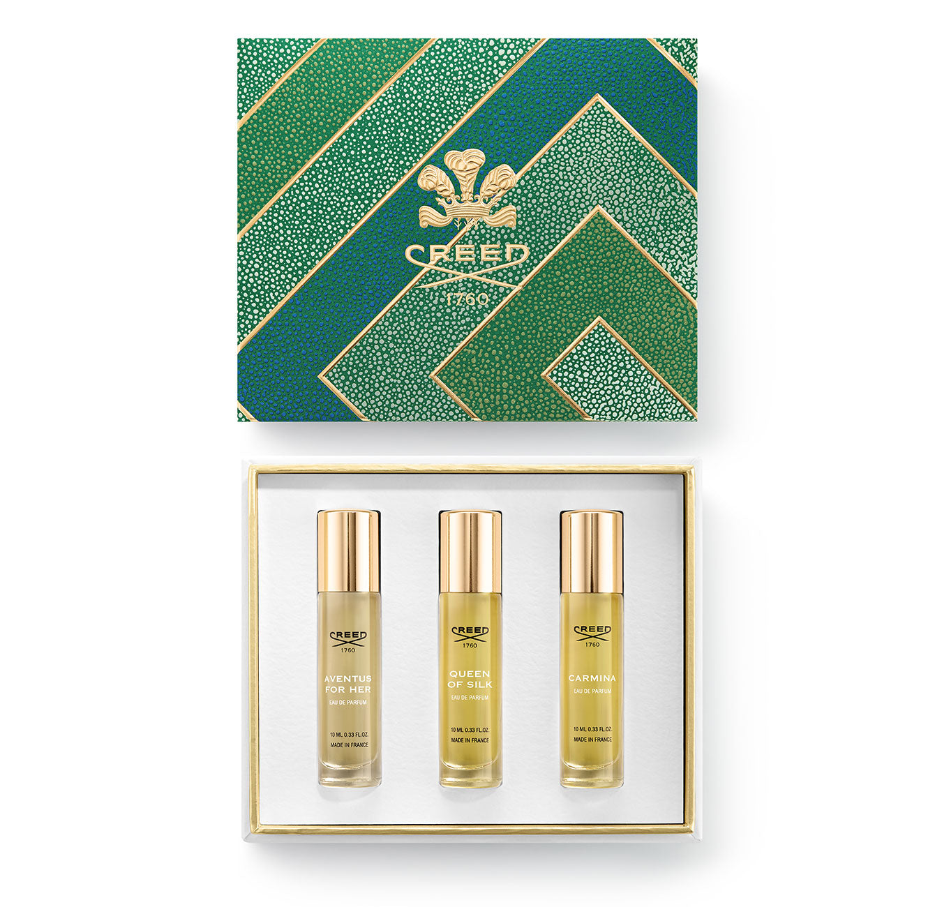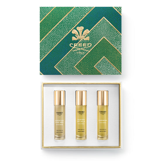 Crafted to inspire and to captivate, the Women’s 3-Piece Gift Set invites them to unwrap excellence through a unique collection of masterpieces from The House of Creed. This set unites Aventus For Her, Carmina and Queen of Silk, three bold expressions of today’s modern woman. Presented in exquisite 10ml editions designed for discovery and celebration, and finished with emerald-green packaging inspired by Art Deco design, this set is a reflection of enduring craftsmanship, curated with the mastery of a tailor’s hand and an eye for thoughtful detail.
