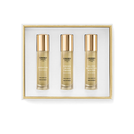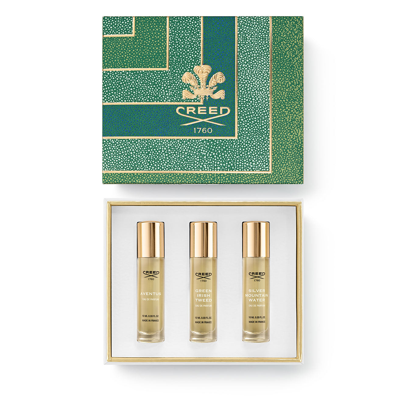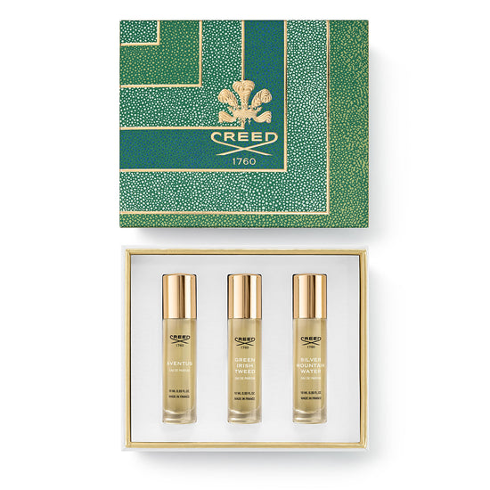 Crafted to inspire and to captivate, the Men’s 3-Piece Gift Set invites them to unwrap excellence through a unique collection of masterpieces from The House of Creed. This set unites Aventus, Green Irish Tweed and Silver Mountain Water, three house signatures, widely celebrated for their unique charm and lasting allure. Presented in exquisite 10ml editions designed for discovery and celebration, and finished with emerald-green packaging inspired by Art Deco design, this set is a reflection of enduring craftsmanship, curated with the mastery of a tailor’s hand and an eye for thoughtful detail.