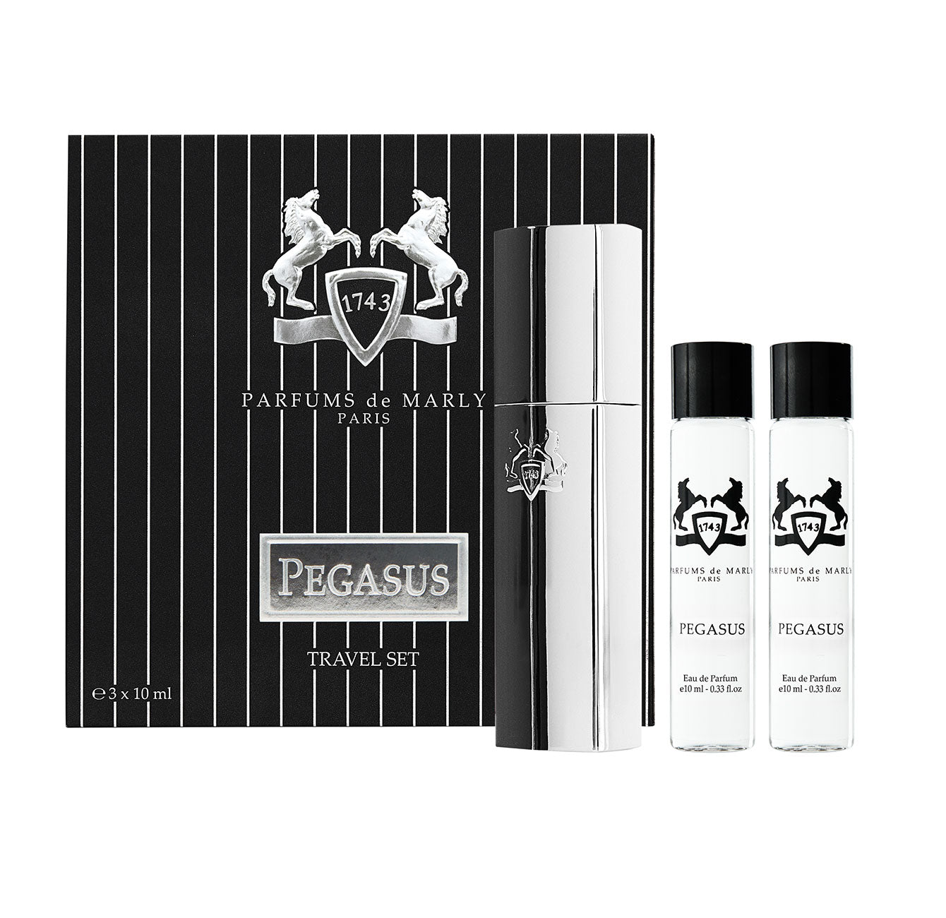 French fine fragrance house, Parfums De Marly revives the spirit of lavish receptions and festivities held in the Château de Marly, for the delight of members of the Royal Court and foreign dignitaries. Pegasus is a heady fougere scent that adds a touch of Equestrian royalty to its distinct masculine flavour that is made up of bergamot, almond, vanilla, sandalwood and amber. Now available in this fabulous travel set with a stylish Zamac atomiser and three 10ml refills.