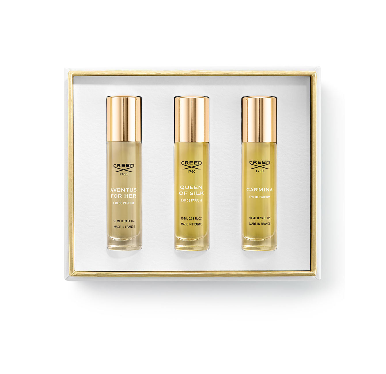Crafted to inspire and to captivate, the Women’s 3-Piece Gift Set invites them to unwrap excellence through a unique collection of masterpieces from The House of Creed. This set unites Aventus For Her, Carmina and Queen of Silk, three bold expressions of today’s modern woman. Presented in exquisite 10ml editions designed for discovery and celebration, and finished with emerald-green packaging inspired by Art Deco design, this set is a reflection of enduring craftsmanship, curated with the mastery of a tailor’s hand and an eye for thoughtful detail.