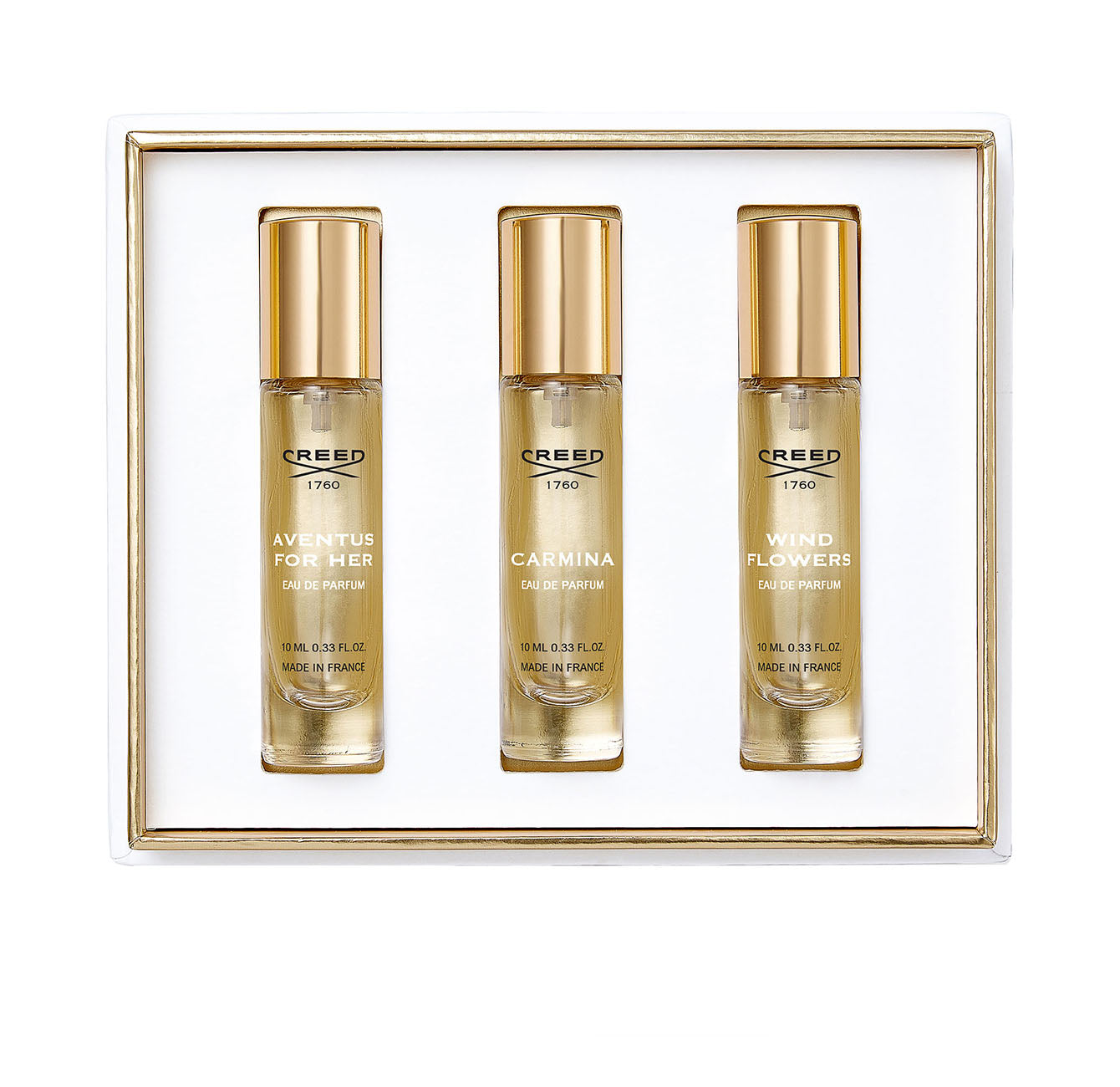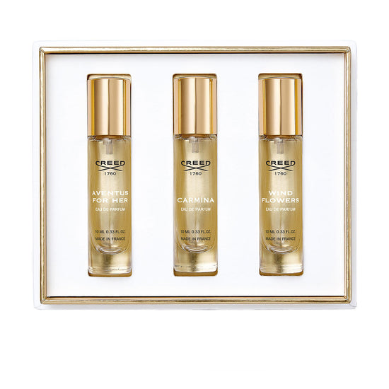 Delight the senses with the Women’s 3-Piece 10ml Fragrance Discovery Set from The House of Creed. This elegant trilogy of timeless classics for the modern woman is a true work of art, presented in an exquisitely embellished gift box that pays tribute to the house’s unique tailoring heritage and its rich equestrian connections throughout the ages. Crafted to leave lasting scented memories, this coveted collection for women contains Aventus For Her, Carmina and Wind Flowers, each in an indulgent yet readily portable 10ml size.